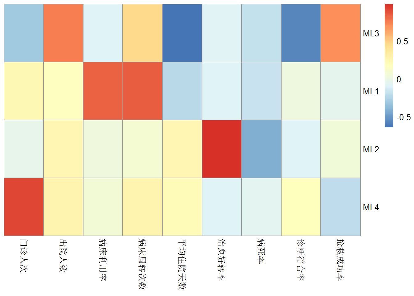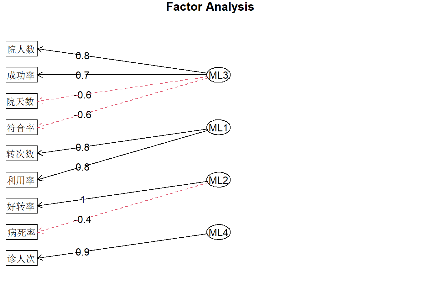 ## Fit based upon off diagonal values = 0.99选择4个因子,最终的累积方差解释是0.68,再看因子载荷矩阵,因子1(MR1)在出院人数、门诊人次、病床周转率、平均住院天数等具有较高的载荷,因子2在门诊人次、病床利用率、病床周转率等具有很大的载荷,因子3在治愈好转率具有较高的载荷,因子4的载荷都较低。