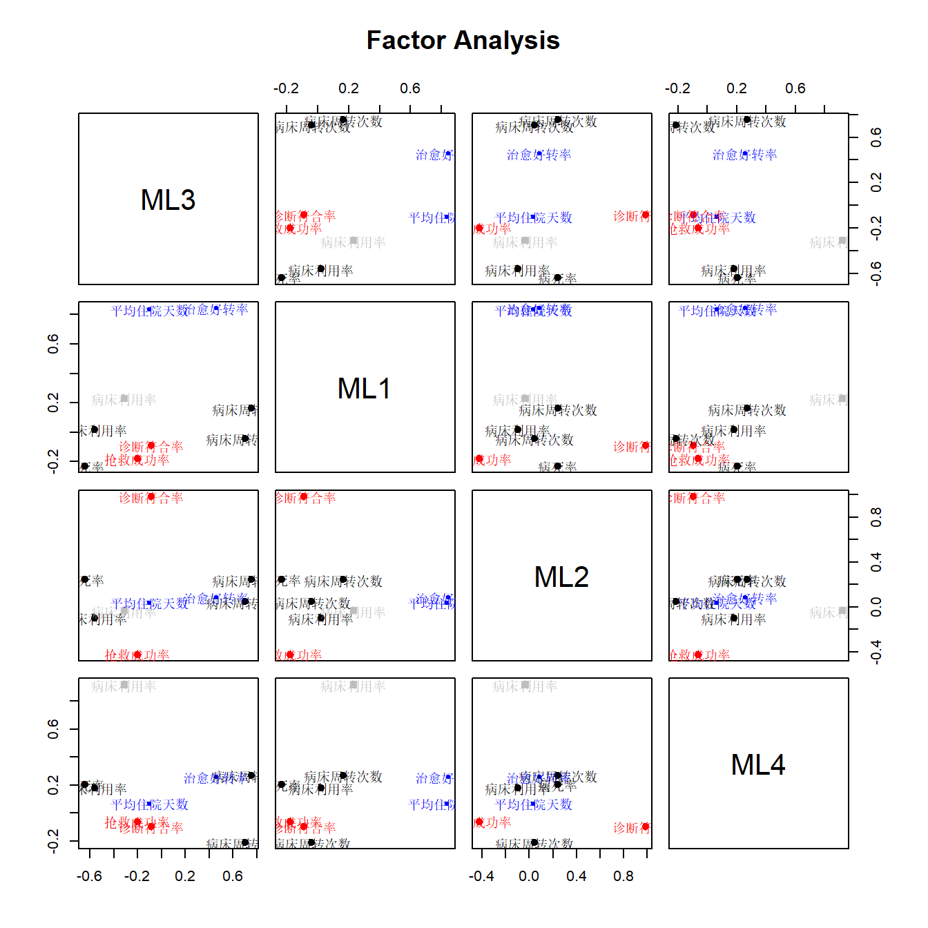 下面这张图是另一种展示方法,只看右上三角或者左下三角即可,是一样的。以右上三角为例:以第一行为例,第一行是ML3这个因子,看第一行第二列的这个子图形,它的横坐标是ML1这个因子,纵坐标是ML3这个因子,图中的点(被文字覆盖住了)是不同的变量,每个点的坐标就是该变量在不同因子上的载荷值。