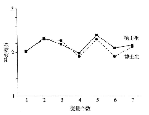 每个问题的回答从好到差按4个等级记分(分别赋值1、2、3、4),7个问题的平均得分的轮廓图见下图,问每个问题硕士生和博士生的回答结果是否相同?