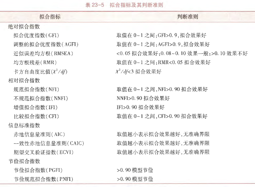 验证性因子分析与结构方程模型的拟合指标基本相同,下表列出了部分常用的拟合指标。