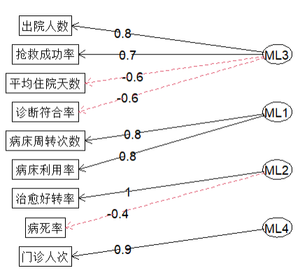 这个图就是一个简单的路径图,展示了4个潜变量和各自的显变量之间的关系,并且标注了因子载荷以及正负,看起来很直观。