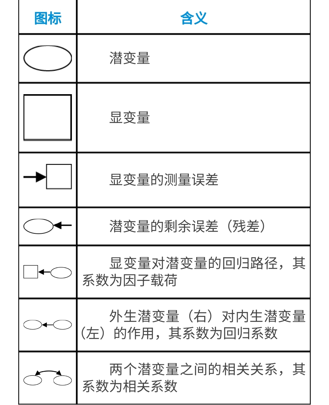 在CFA和SEM中,变量之间的关系比这个要复杂的多,为了规范,路径图中的圆圈、方框、箭头等都有明确的含义,以下是简单说明: